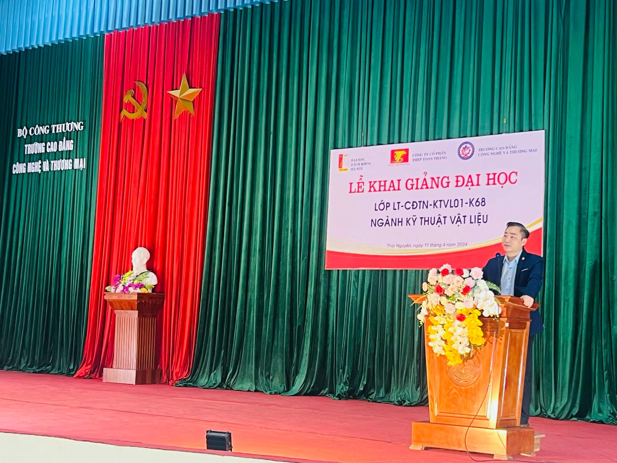 Sáng nay 11/04/2024 được sự đồng ý của Ban Giám đốc, Trung tâm Đào tạo liên tục - Đại học Bách Khoa Hà Nội, Công ty Cổ phần Thép Toàn Thắng, Trường Cao đẳng Công nghệ và Thương mại đã phối hợp tổ chức Lễ khai giảng lớp LT – CĐTN – KTVL01 – K68 ngành Kỹ thuật Vật liệu.