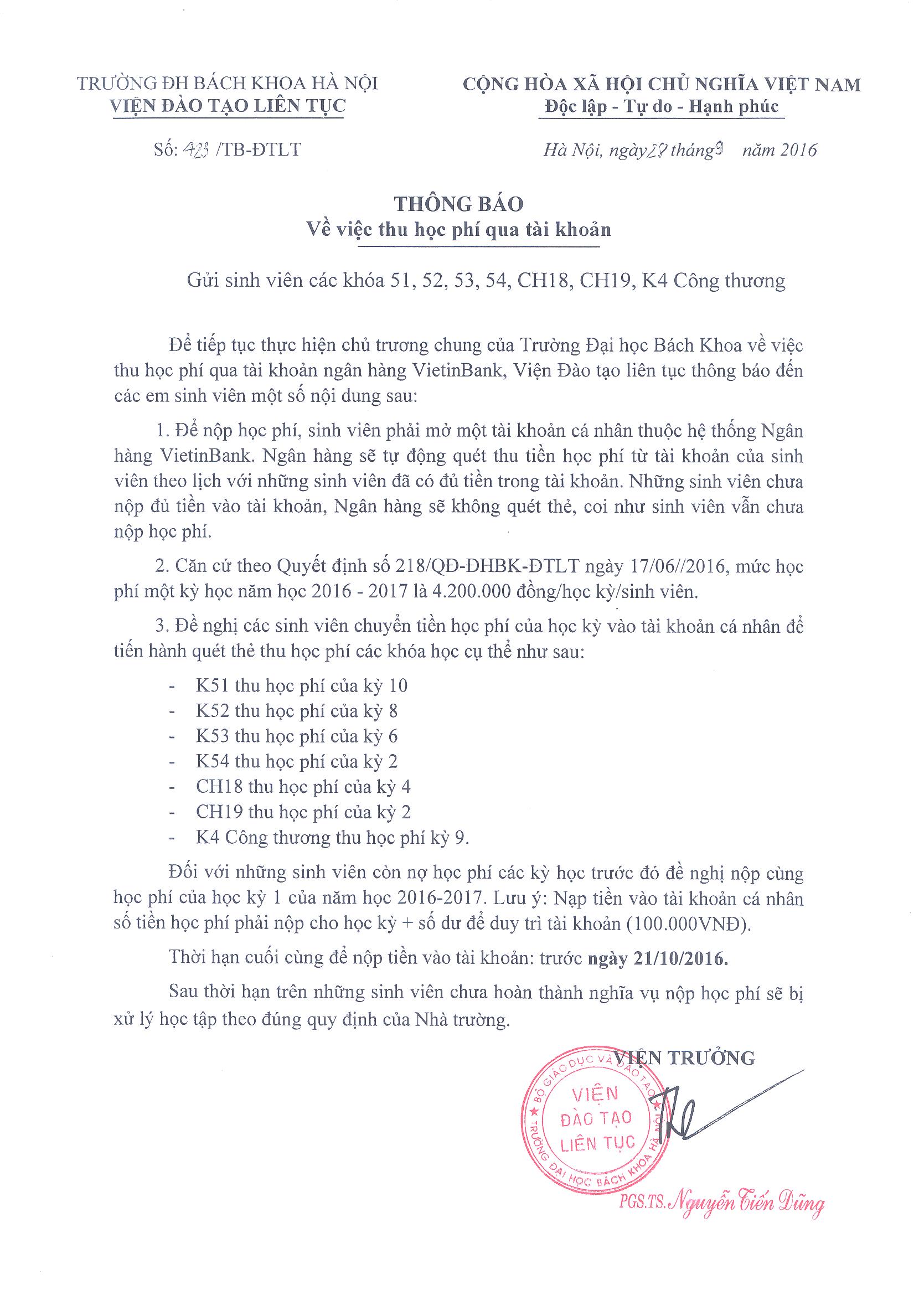 Thông báo của Viện trưởng Viện ĐTLT v/v thu học phí qua tài khoản: Gửi SV K51, 52, 53, 54, CH18, CH19, K4 Công thương HN